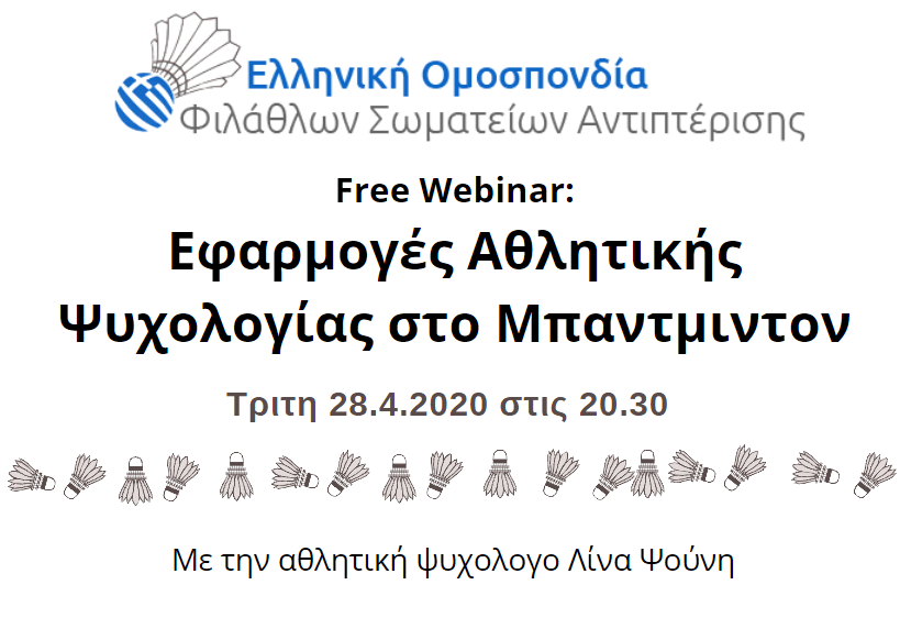 Δωρεάν Διαδικτυακό σεμινάριο Αθλητικής Ψυχολογίας, την Τρίτη 28.4.2020 στις 20.30. Όποιος επιθυμεί να παρακολουθήσει μπορεί να συμπληρώσει την φόρμα συμμετοχής και θα σταλούν οι οδηγίες μέσω email.