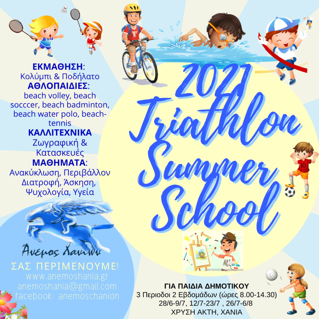 Ο ΑΠΣ Ανεμος, για 4η συνεχή χρονιά, θα διοργανώσει ολοήμερο πρόγραμμα αθλητικής απασχόλησης και γνωριμίας με το τρίαθλο, στο οποίο μπορούν να συμμετέχουν παιδιά ηλικίας 6-12 ετών. Η διάρκεια της κάθε περιόδου θα είναι για 10 (εργάσιμες) ημέρες, απο τις 8 το πρωί έως τις 14.30 το μεσημέρι, με έναρξη την Δευτέρα 28/6/2021.