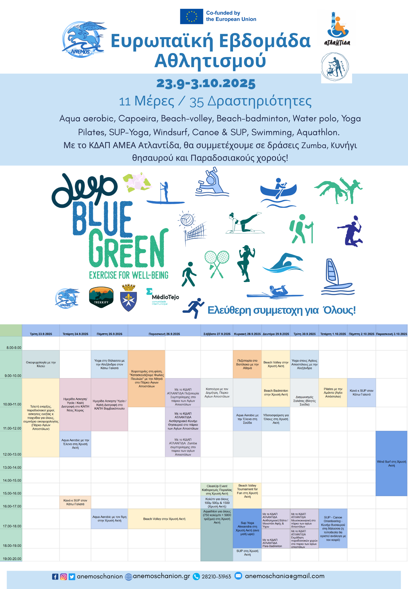 Η έναρξη της Ευρωπαϊκής εβδομάδας αθλητισμού πραγματοποιήθηκε με πολύ μεγάλη επιτυχία την Τρίτη 23.9.2025, το πρωί στο πάρκο των Αγίων Αποστόλων. Οι δράσεις ξεκίνησαν με ένα σεμινάριο για τις τεχνικές της οικοψυχολογίας και ακολούθησαν οι δράσεις άσκησης με περίπατο, χορούς, ασκήσεις ευεξίας και διασκεδαστικά παιχνίδια για όλους. Συμμετείχαν πάνω απο 100 άτομα απο τα ΚΑΠΗ του Δήμου Χανίων, το ΚΗΦΗ όπως και δημότες που ήρθαν για τη δράση. Το πρόγραμμα αποτελεί μέρος του Ευρωπαικού πρότζεκτ Deep Blue Green το οποίο πραγματοποιείται παράλληλα σε 4 χώρες, Ελλάδα, Ιταλία, Πορτογαλία και Μάλτα, μάλιστα κατά τη διάρκεια της εκδήλωσης πραγματοποιήθηκε βιντεοκλήση με τις άλλες χώρες όπου γινόταν παράλληλα η έναρξη των εκδηλώσεων.